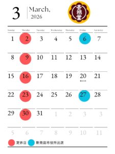 2026年3月3日 / Last updated : 2026年3月9日 admin お知らせ 2026年03月の定休日のお知らせ 2026年3月営業日のお知らせ 月曜日を定休日でお休みさせていただきます。 3月6日(金)・27日(金) 新発田市役所札の辻広場にて出店します。 12:00〜13:30の予定です。 よろしくお願いいたします。 FacebookXBlueskyCopy